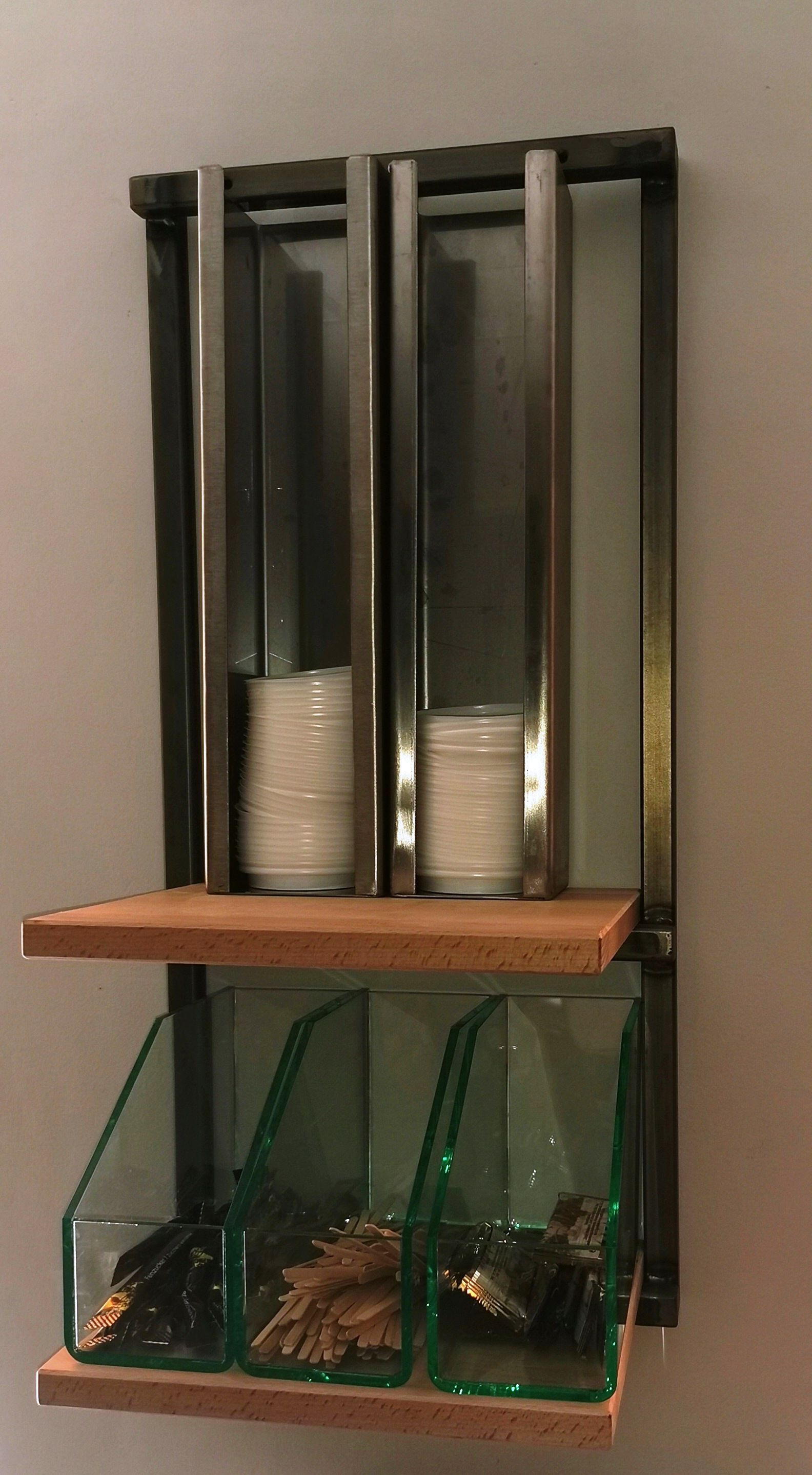 Rührstäbe, Milchdöschen und Deckel,... top organisiert mir unserem praktischen Dekoregal aus unserer Serie "fabric". Mit dabei sind praktische Deckelspender und Zubehörschütten.